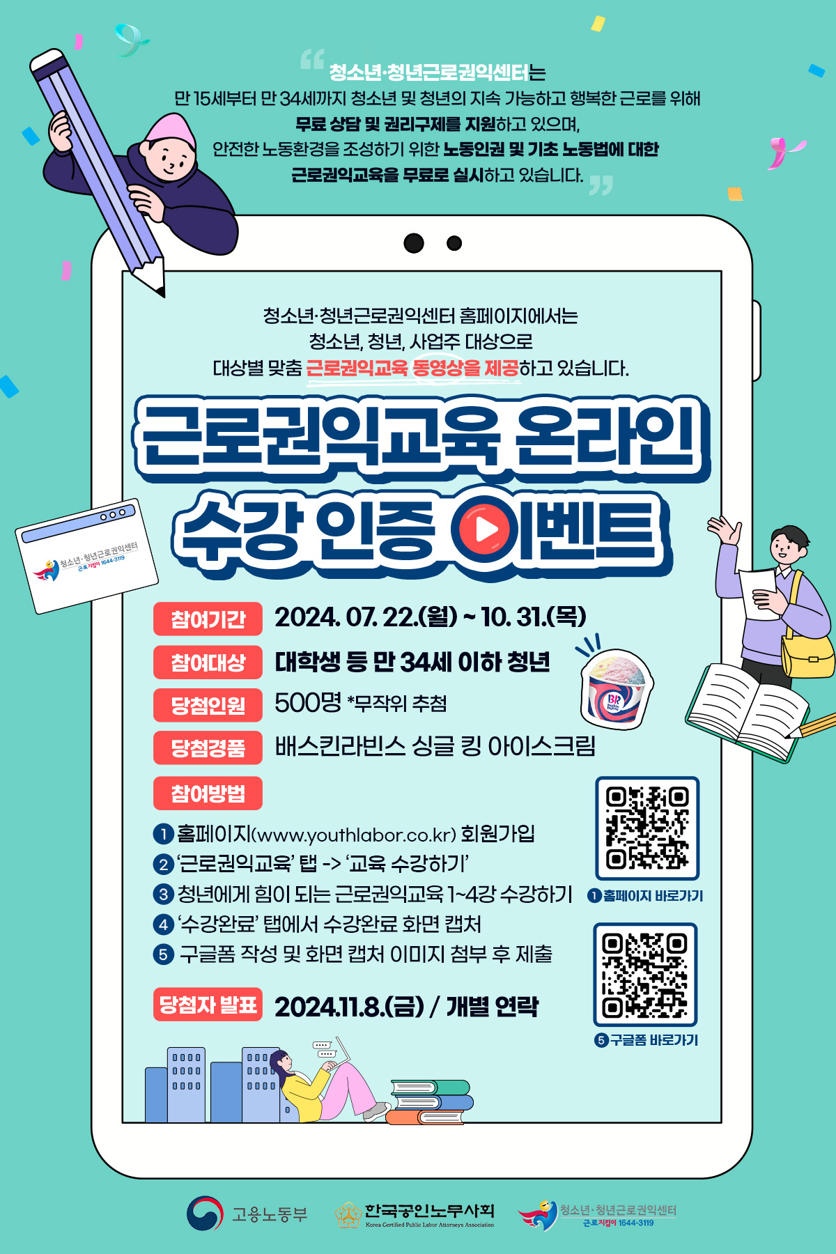 [이벤트] 2024 청소년·청년근로권익센터 근로권익교육 온라인 수강 인증 이벤트