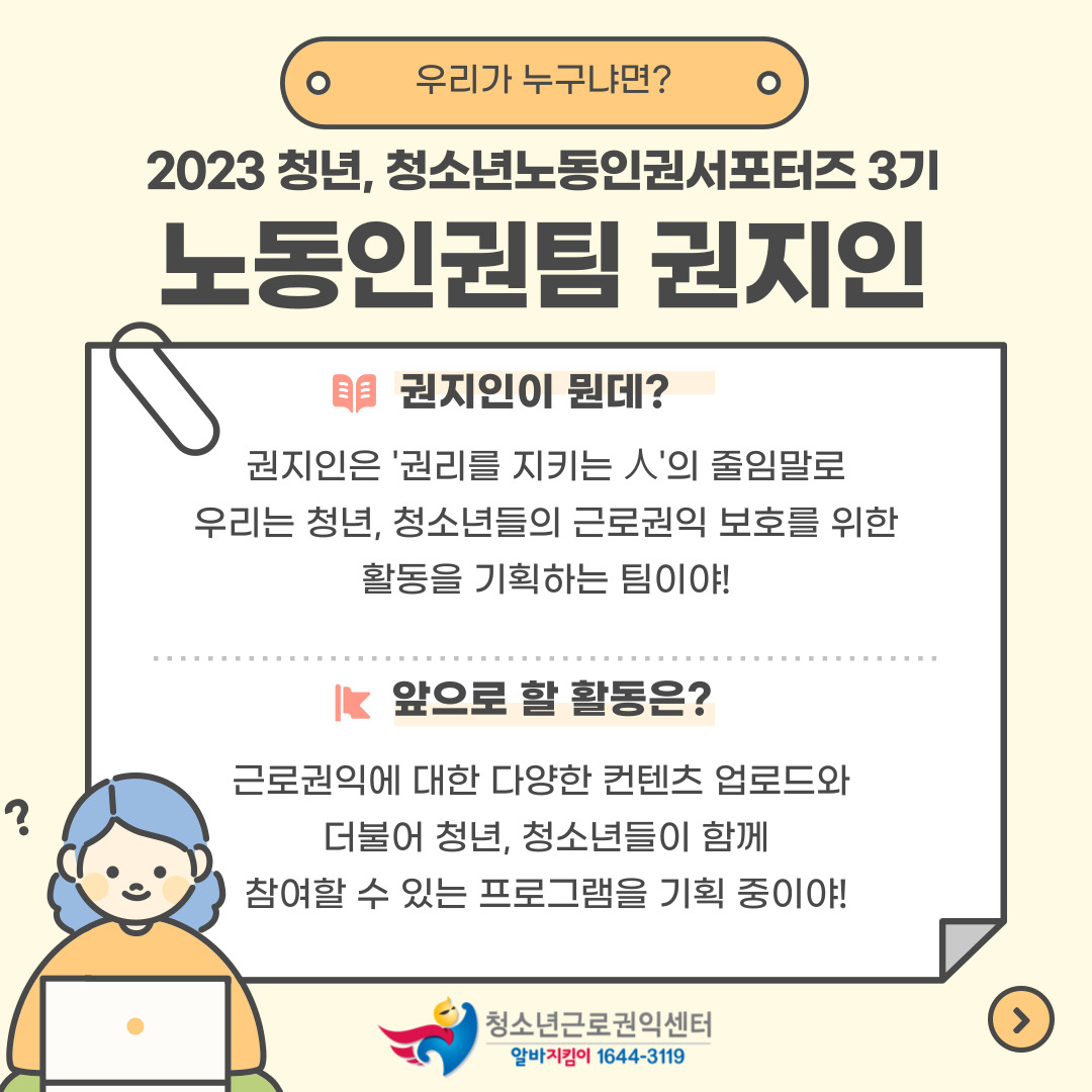 저희는 청소년근로권익센터 청년,청소년 노동인권 서포터즈 3기 노동인권팀