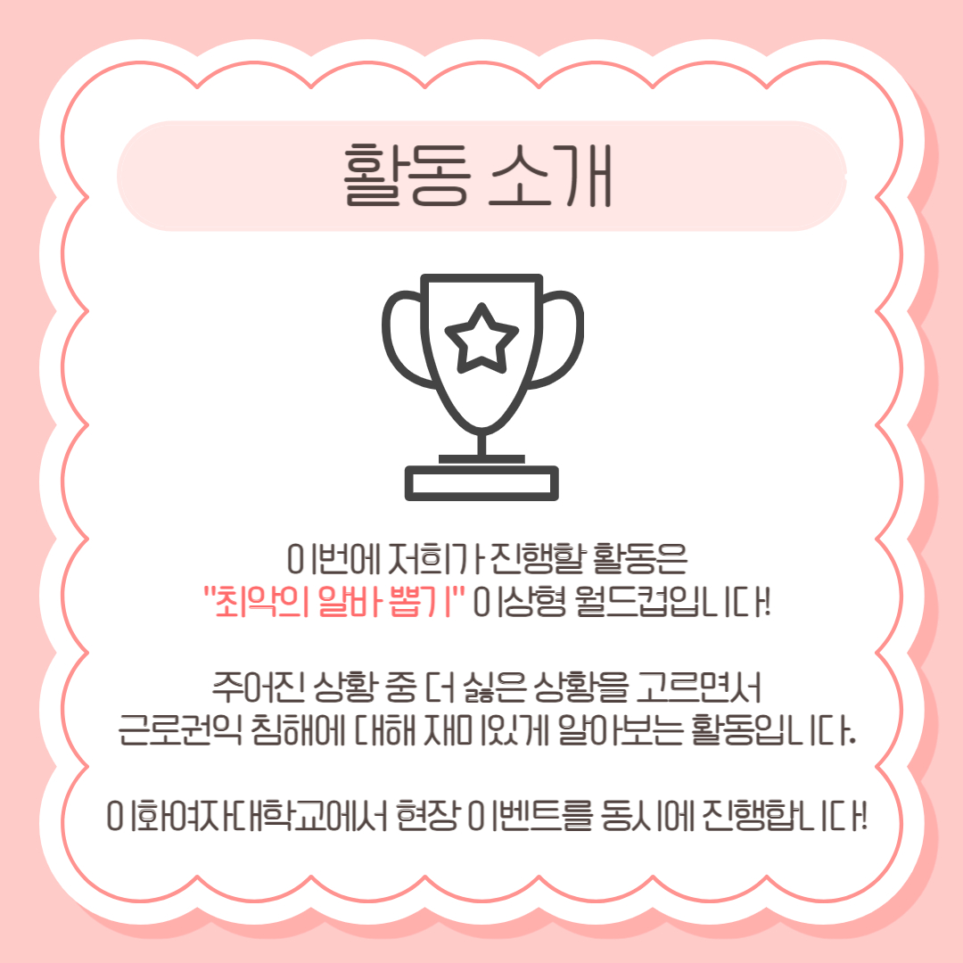 이번에 저희가 진행할 활동은 "최악의 알바 뽑기" 이상형 월드컵입니다!![]()