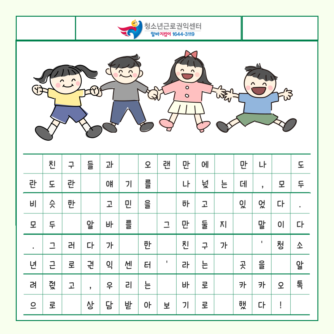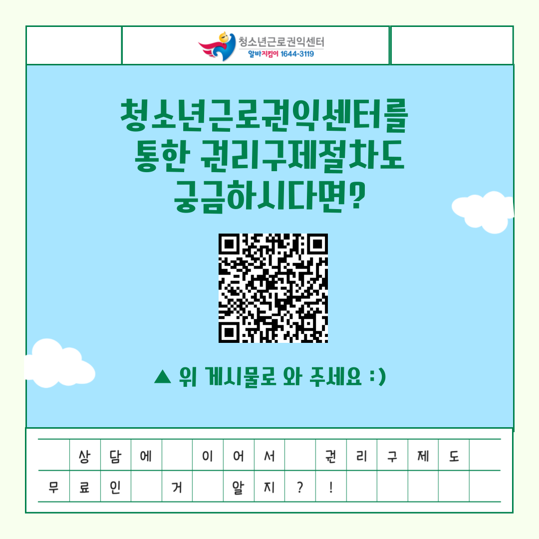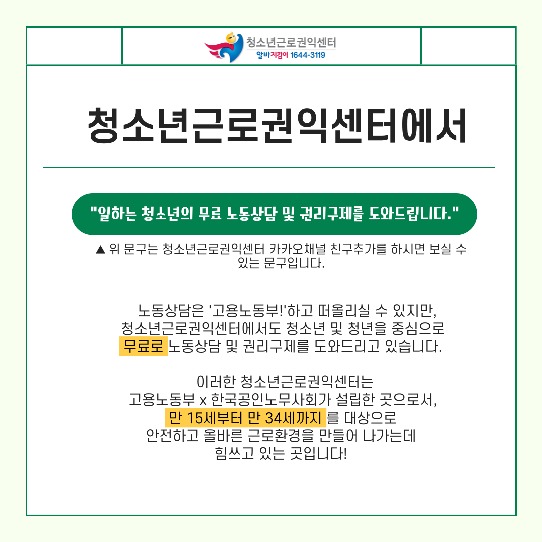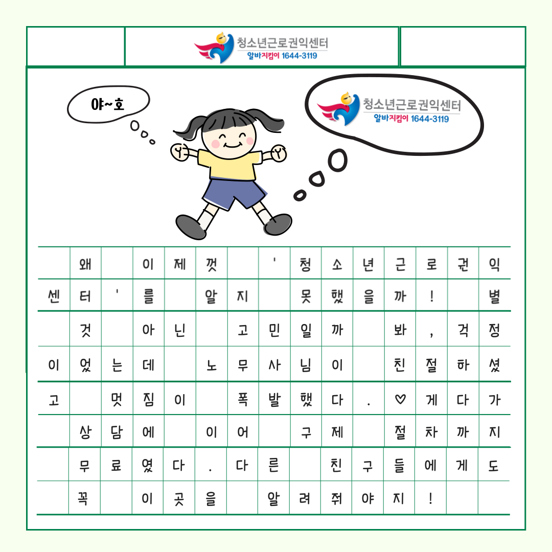앞으로 알바를 하실 때 늘 ‘청소년근로권익센터’를 기억해주세요! ![]()