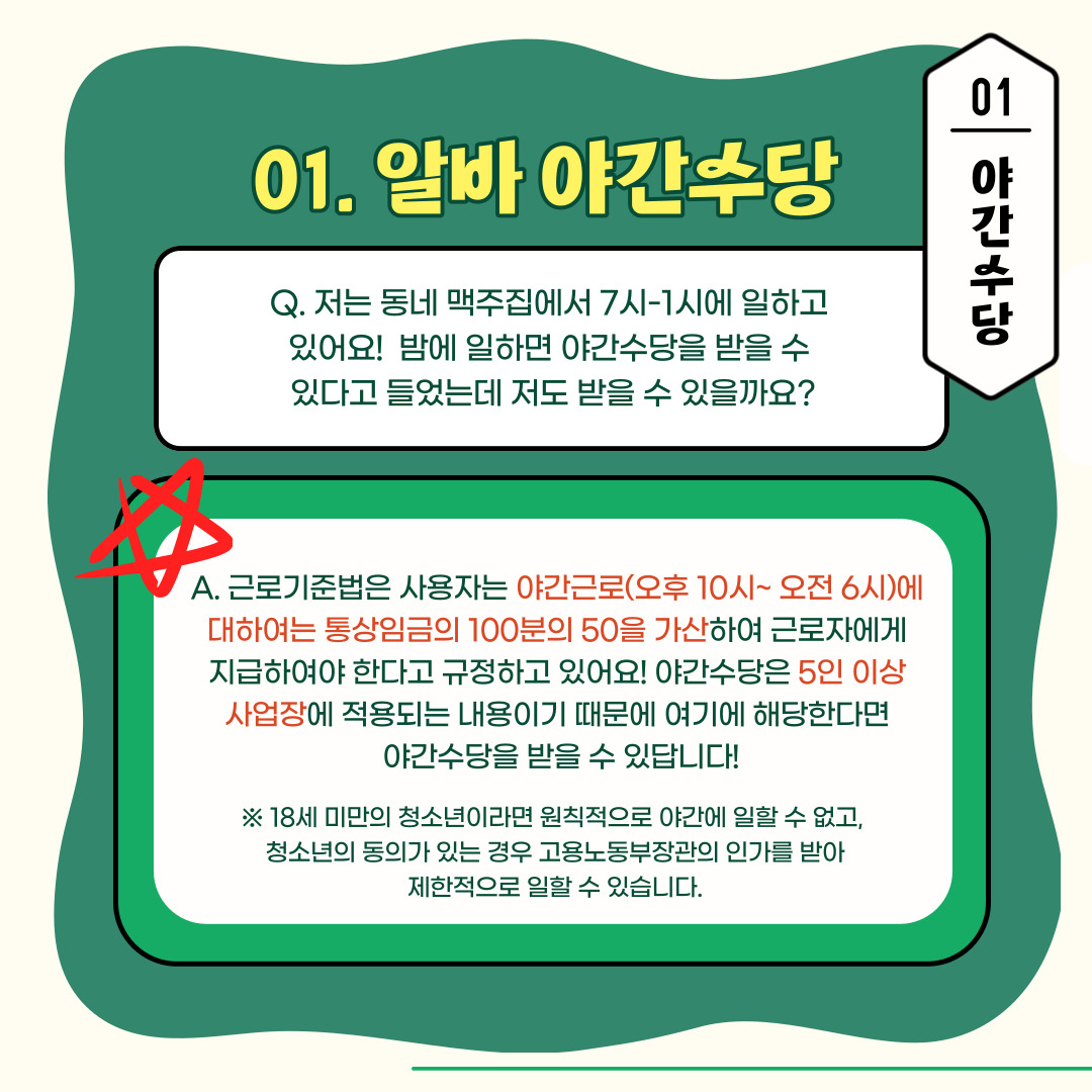 카드뉴스에는 야간수당, 소정근로시간, 해고, 유급휴가 등을 담았습니다.