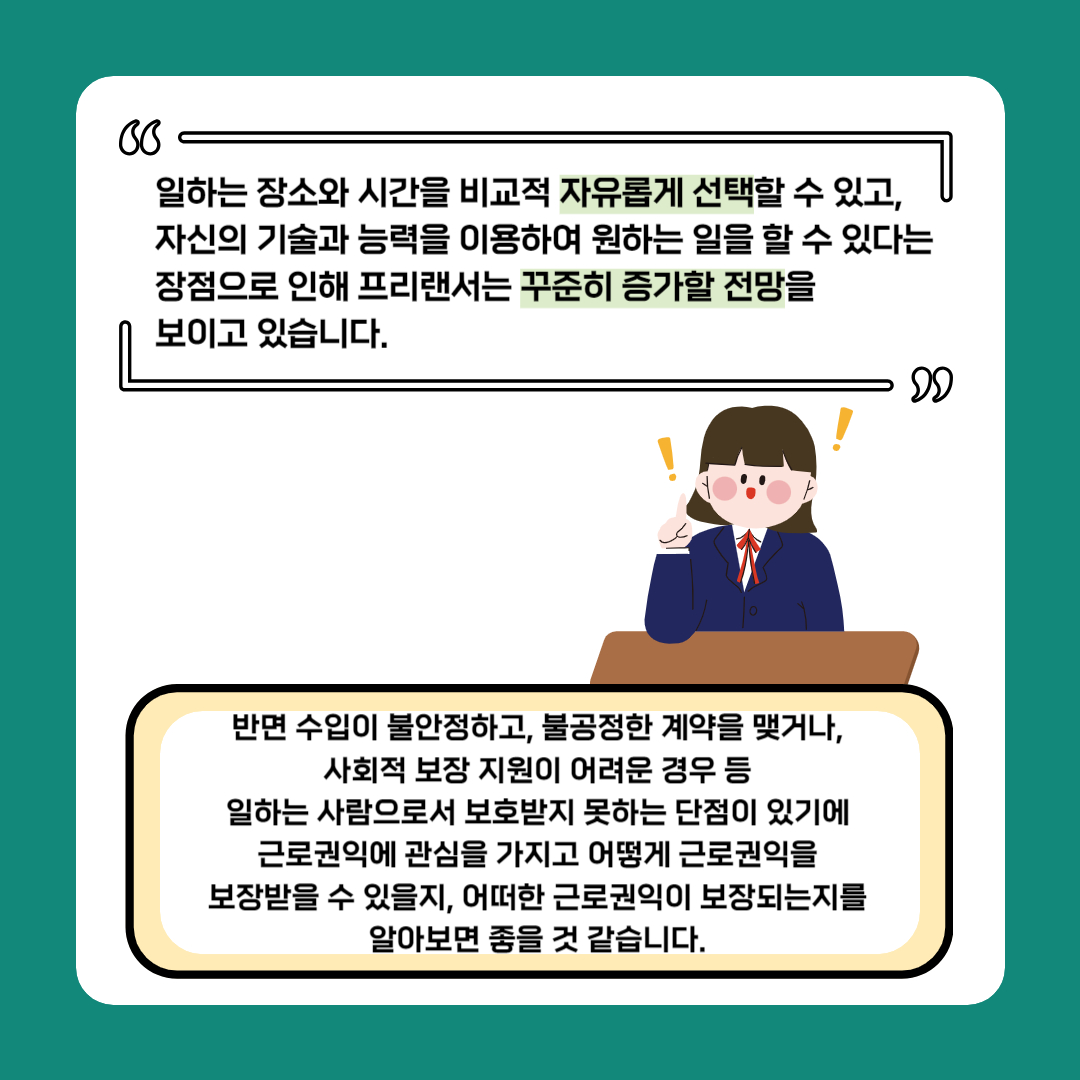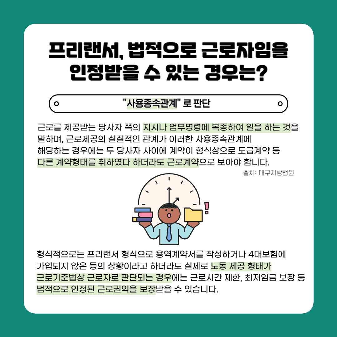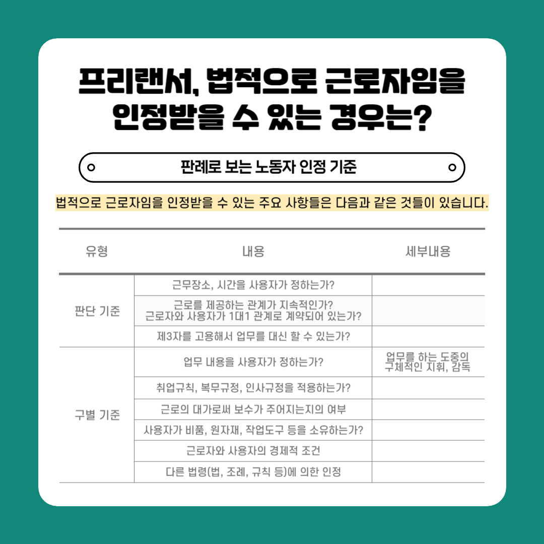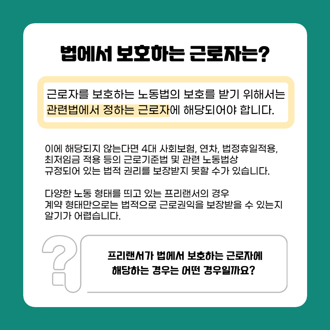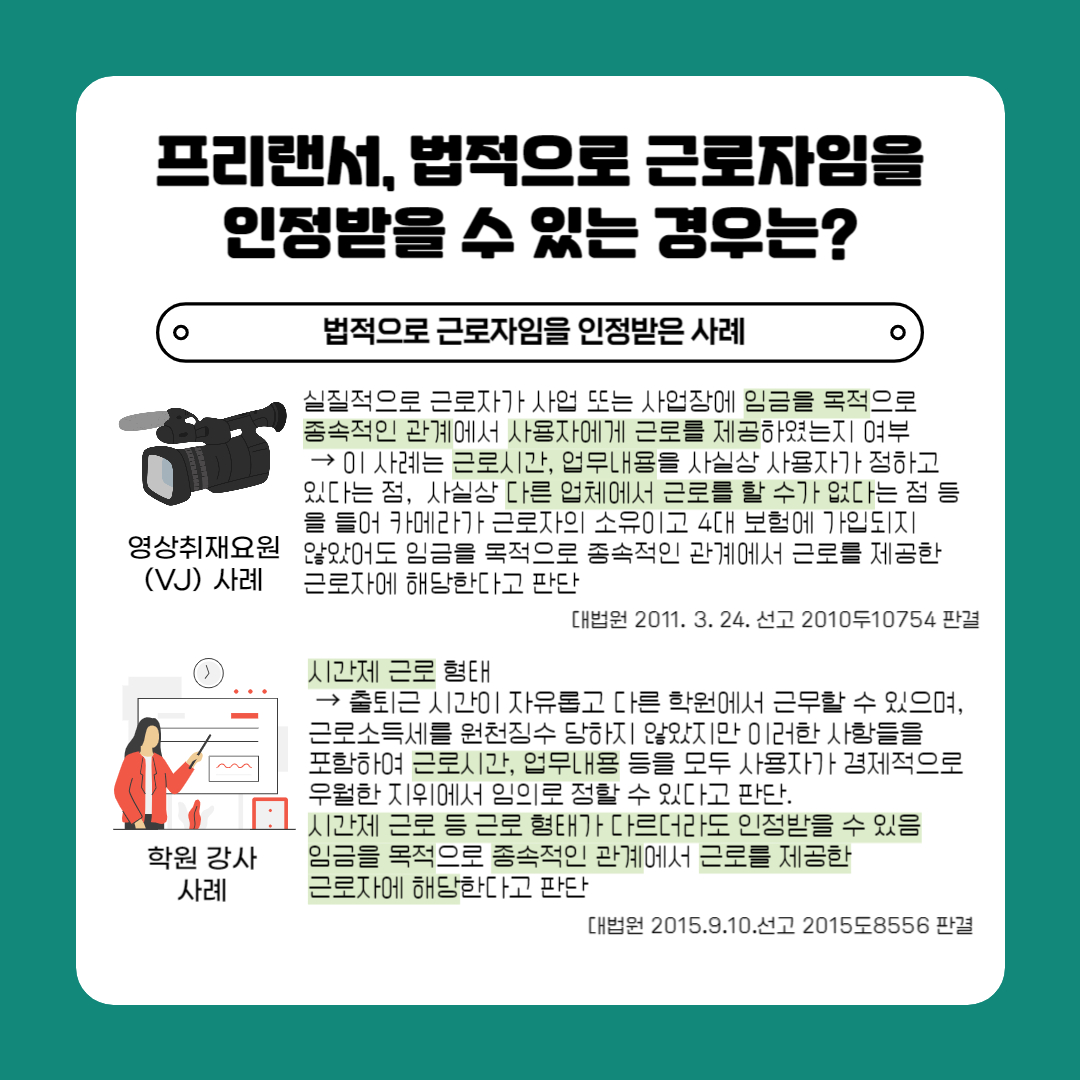 프리랜서는 법적으로 근로자임을 인정받을 수 있을지 카드뉴스를 통해 알아봐요