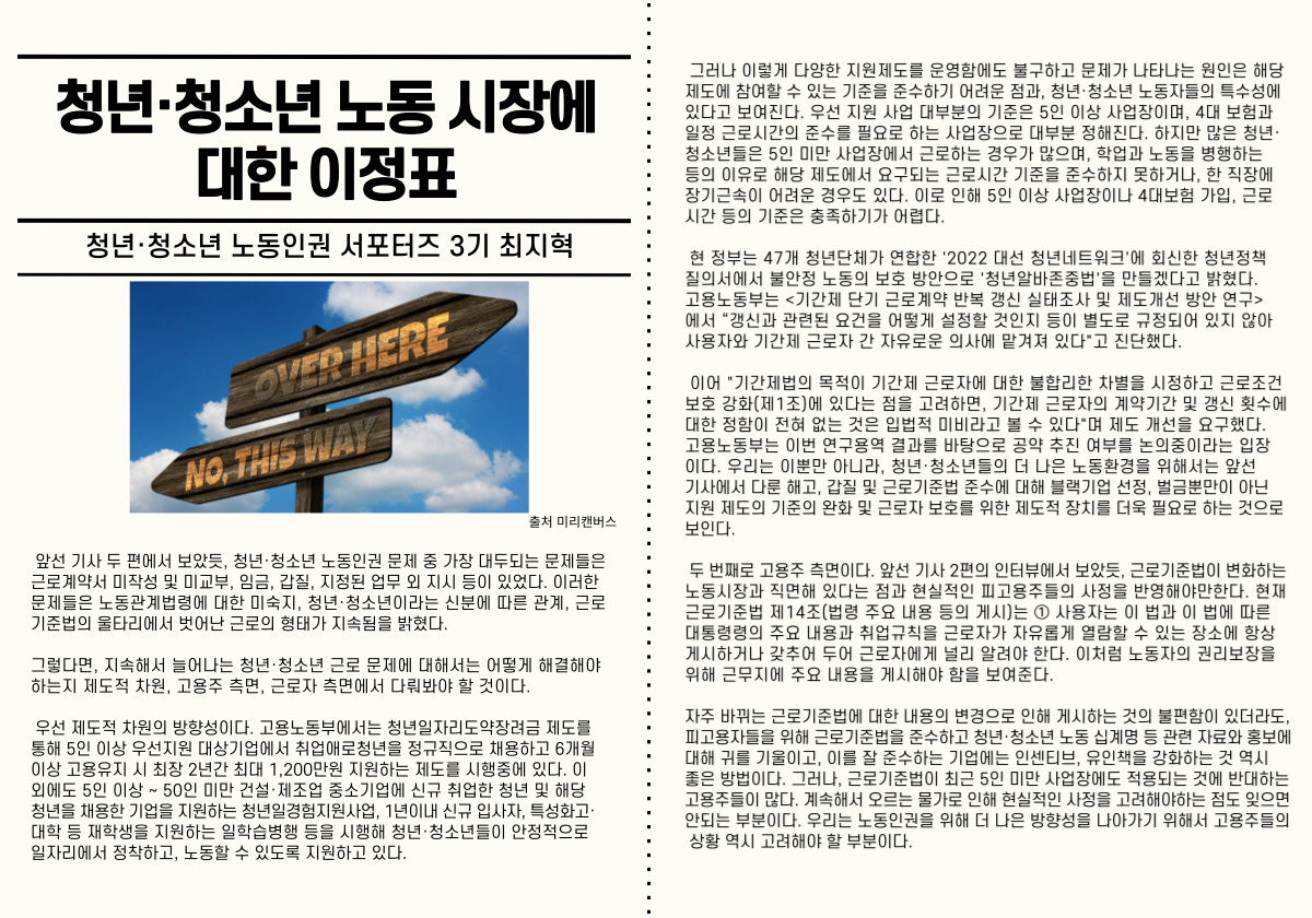 [노동인권 서포터즈] [기획기사] 청년·청소년 노동 시장에 대한 이정표
