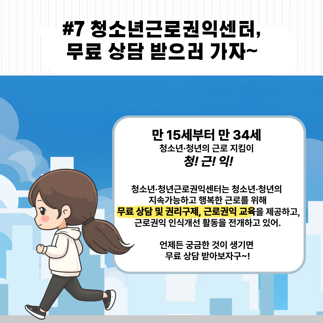 만 15세부터 34세까지는 모두 청소년청년근로권익센터에서 무료 상담 받을 수 있다는 것을 기억해주세요!