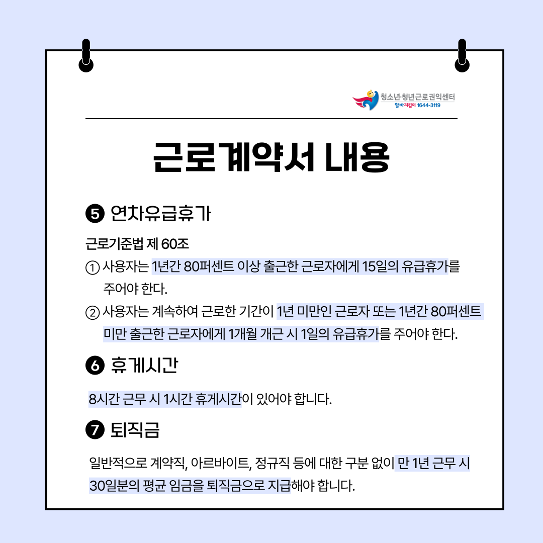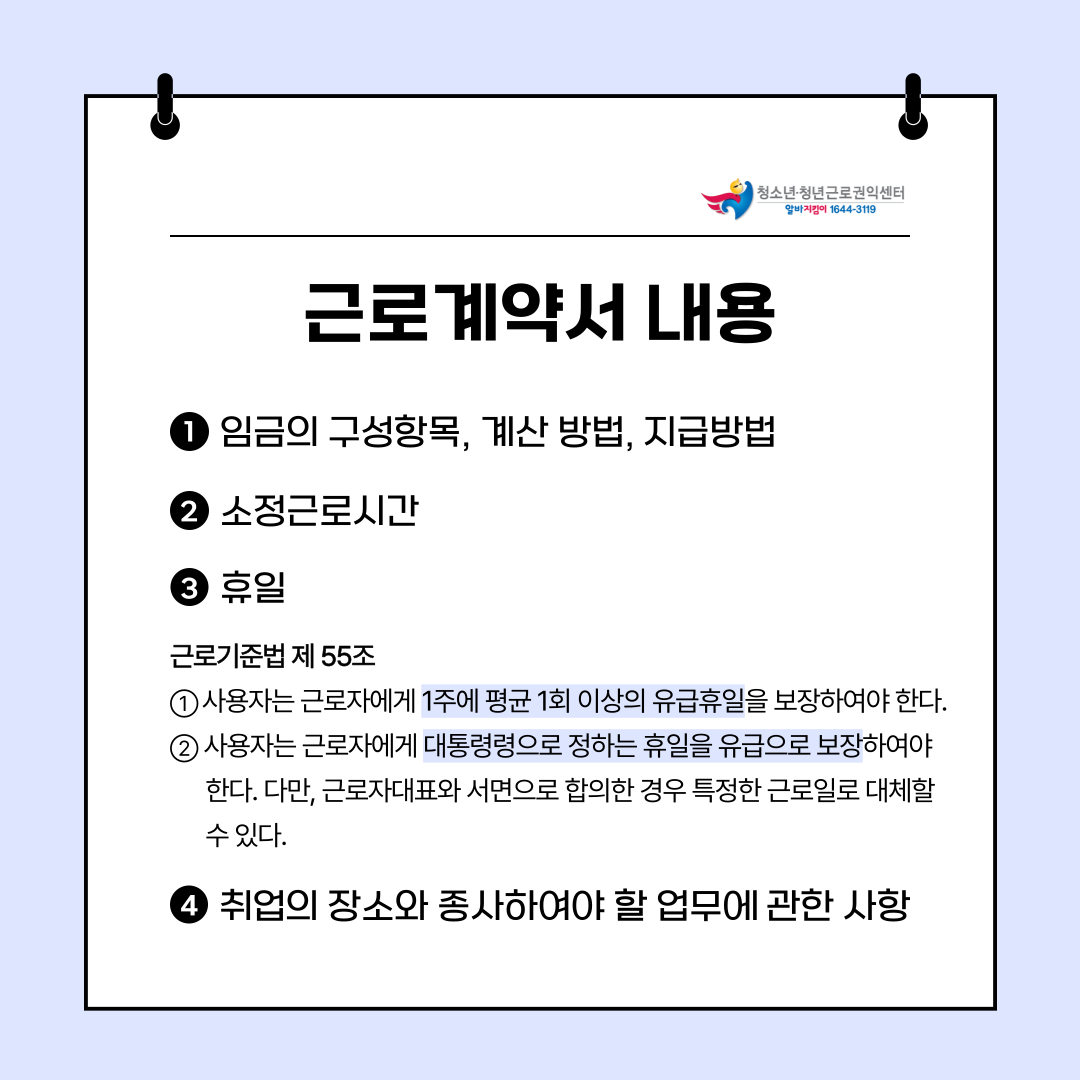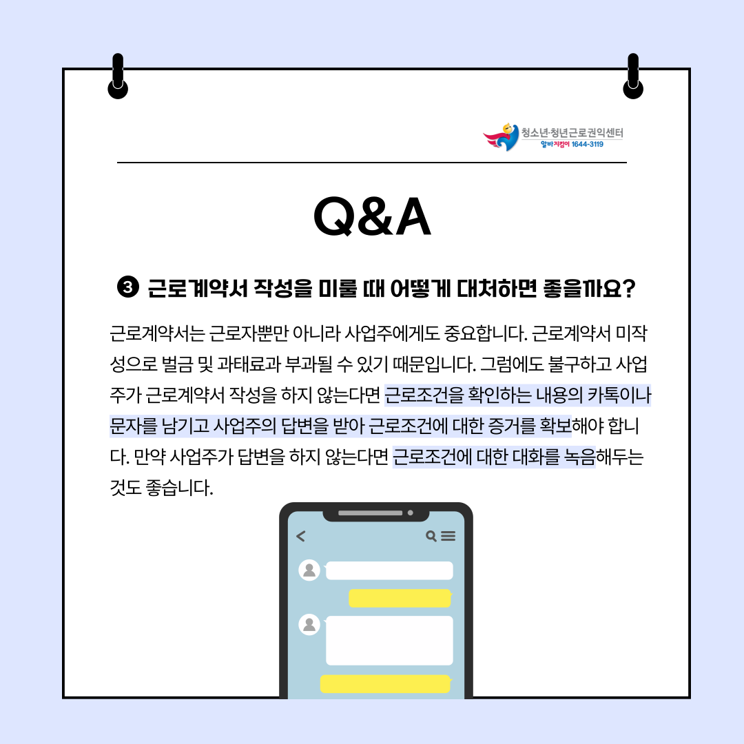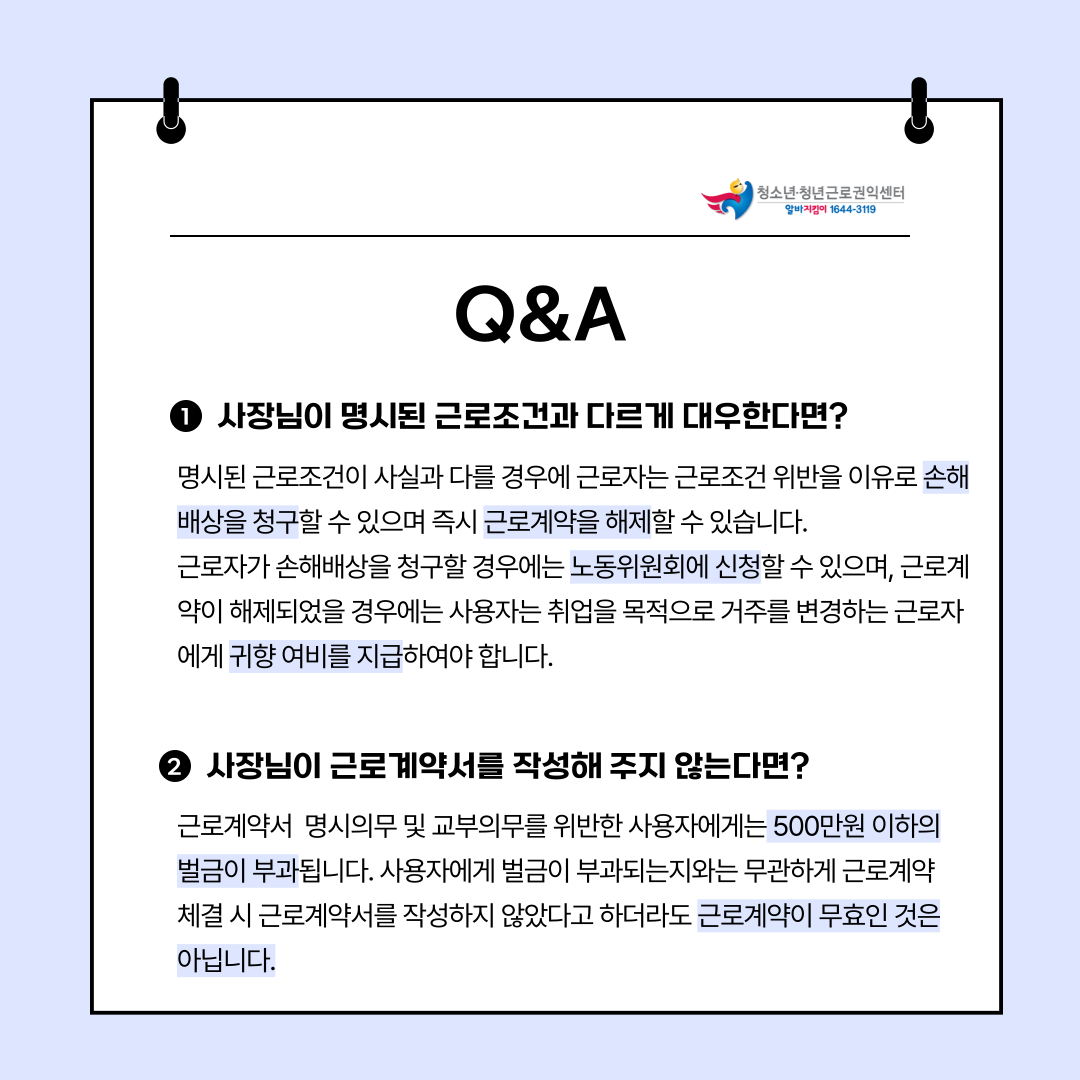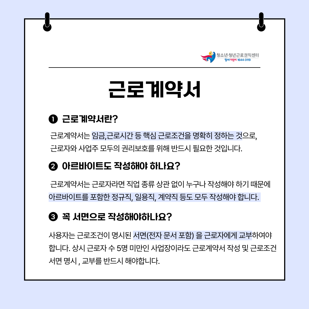 근로계약서 작성과 관련한 질문 사항이 있다면 청소년근로권익센터를 찾아주세요!