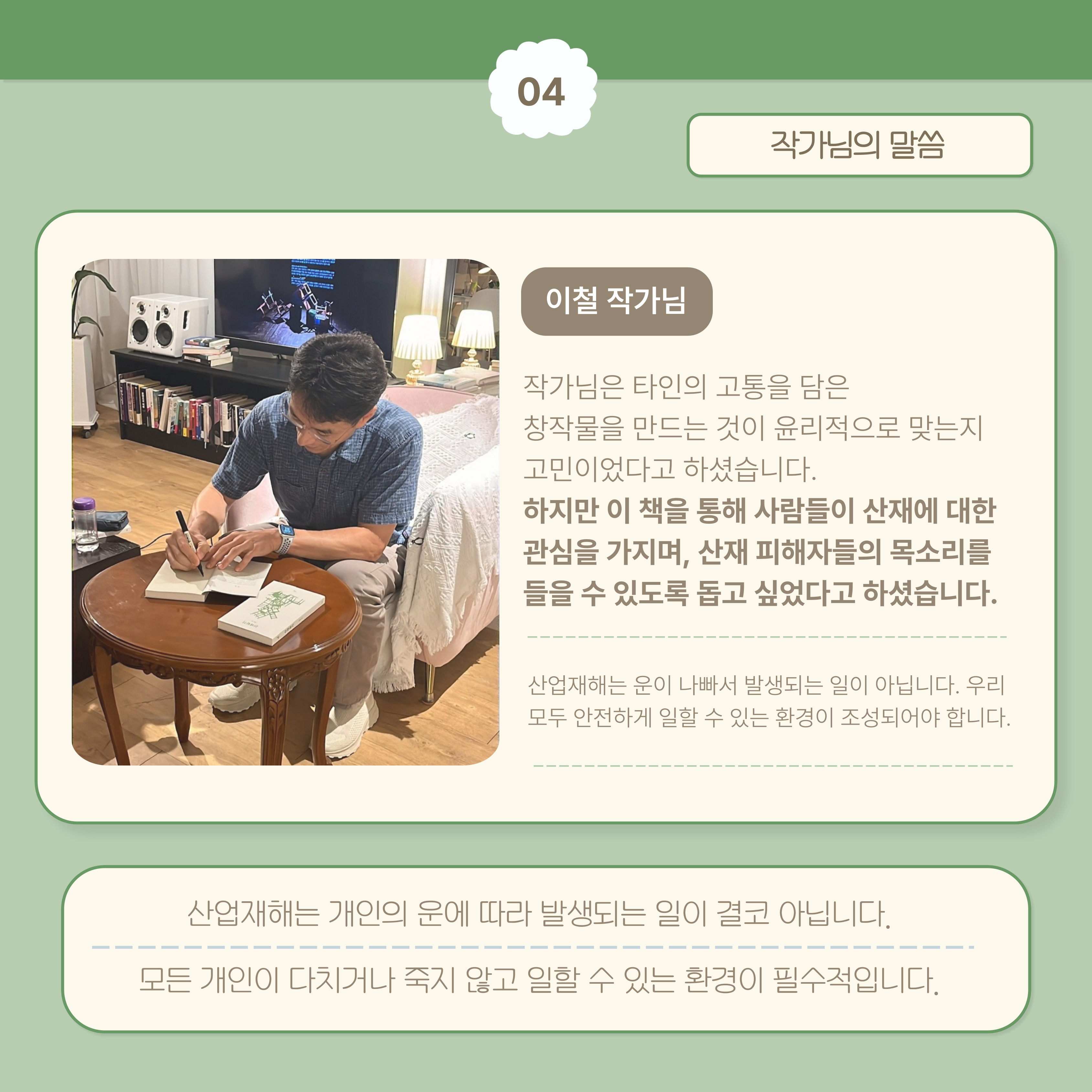 사실 이 책은 직접 산재를 겪은 분들, 그리고 그분들의 가족이나 친구 등의 주변인들,