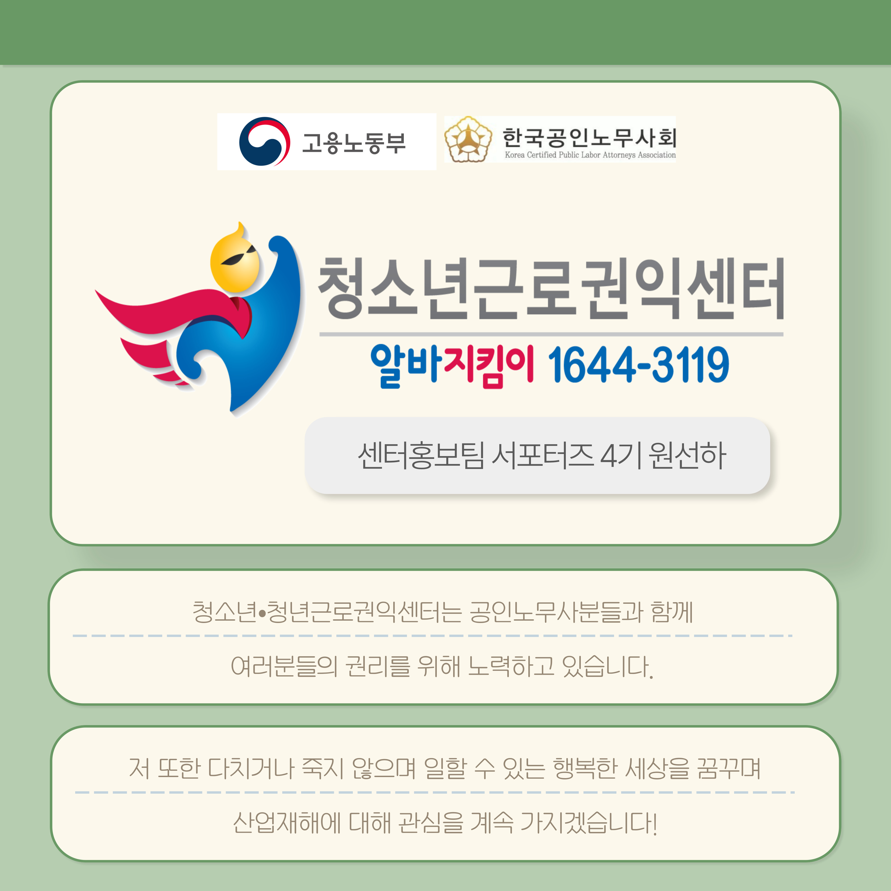 안녕하세요 여러분 ! 청소년·청년근로권익센터 서포터즈 4기 원선하입니다!