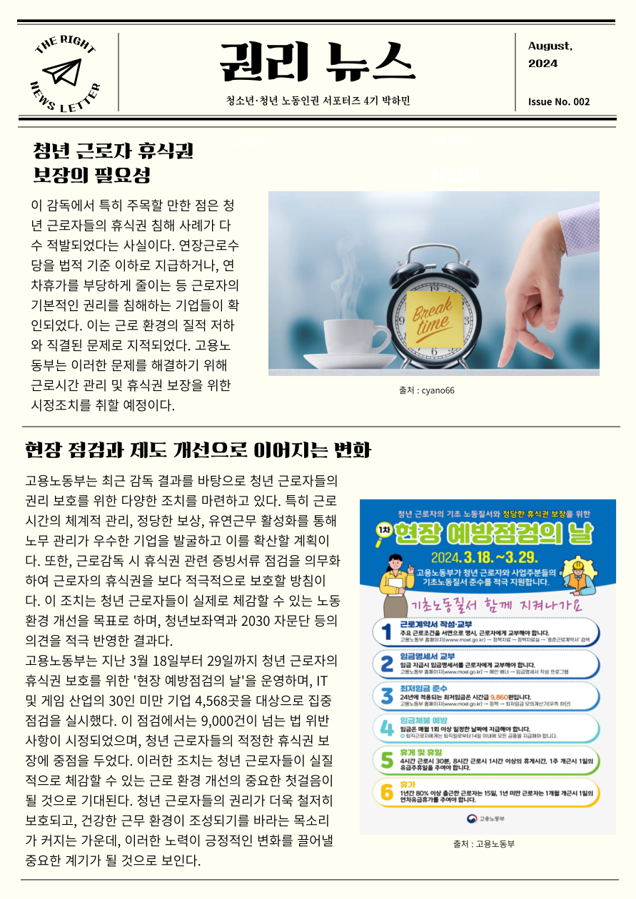 청년 근로자 권리 위협의 실태, 휴식권 보장 필요성, 고용노동부의 현장 예방점검의 날 등과 관련된 유용한 정보들을 담아보았는데요?