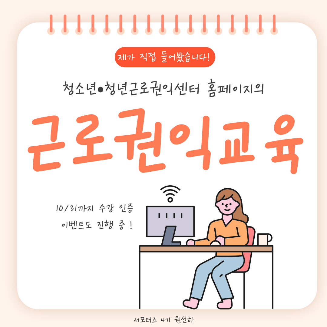 안녕하세요 여러분, 청소년•청년 노동인권 서포터즈 4기 원선하입니다!