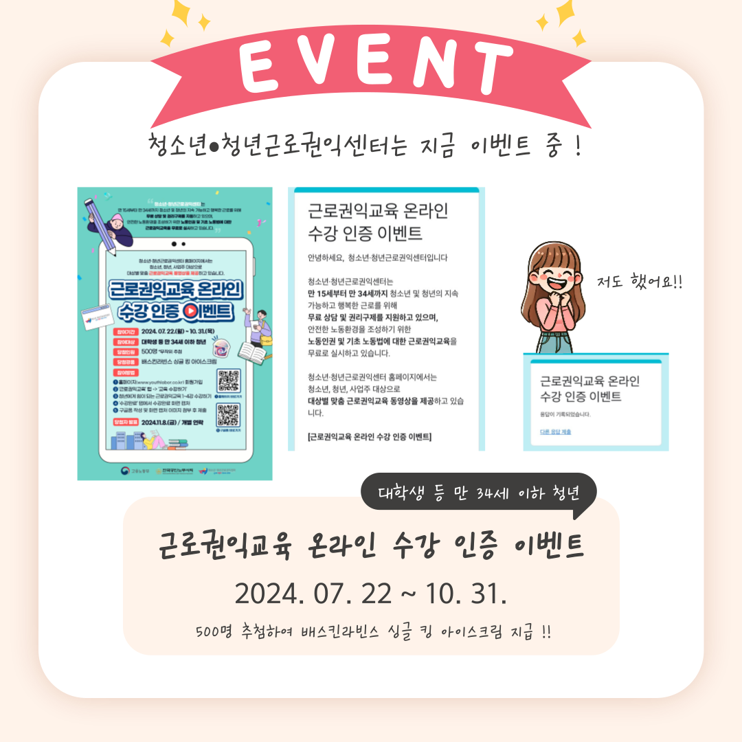 현재 청소년•청년근로권익센터에서 수강 인증 이벤트도 진행하고 있으니 여러분도 꼭 들어보시고 이벤트도 참여해보세요!?