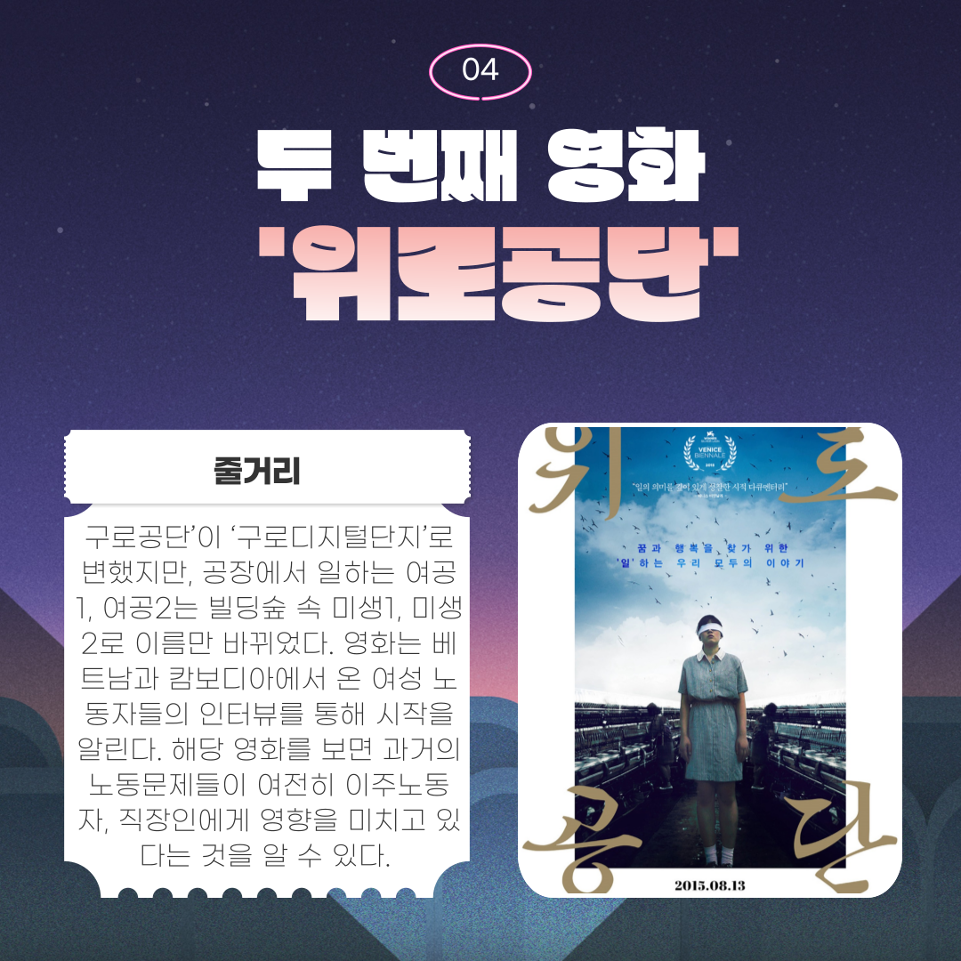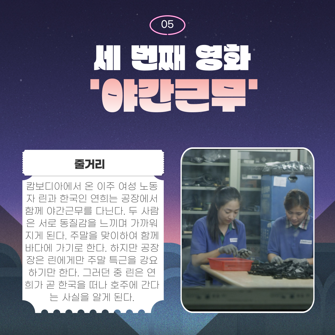 이주노동자들을 다루고 있는 영화를 통해 앞으로 우리 사회가 이주노동자 처우에 있어 개선해야할 점은 무엇인지 생각해보는 시간을 되었으면 좋겠습니다.