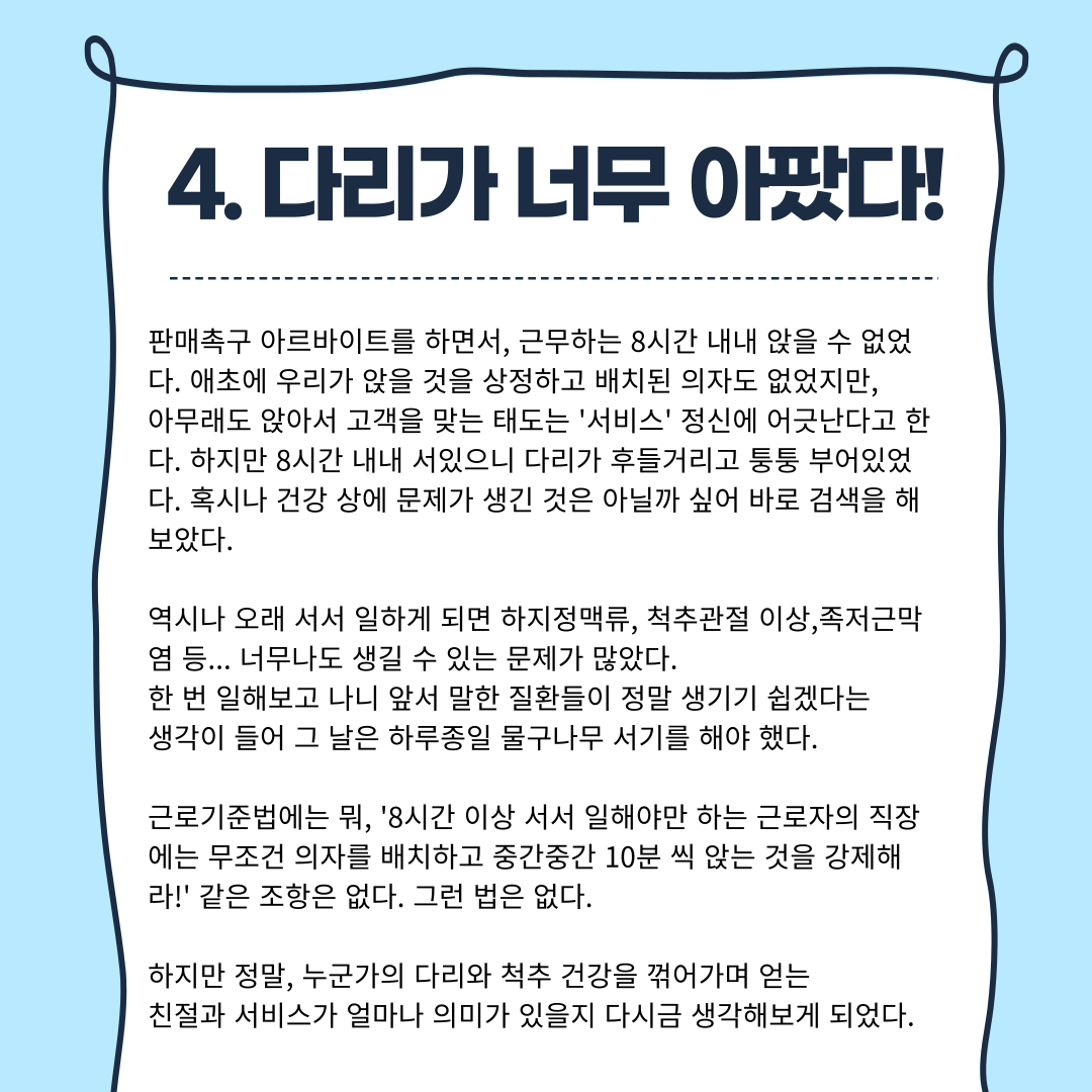 더불어, 노동법의 시야가 미치지 않는 '앉아서 쉴 수 있는 권리'에 대해 생각해보았습니다.