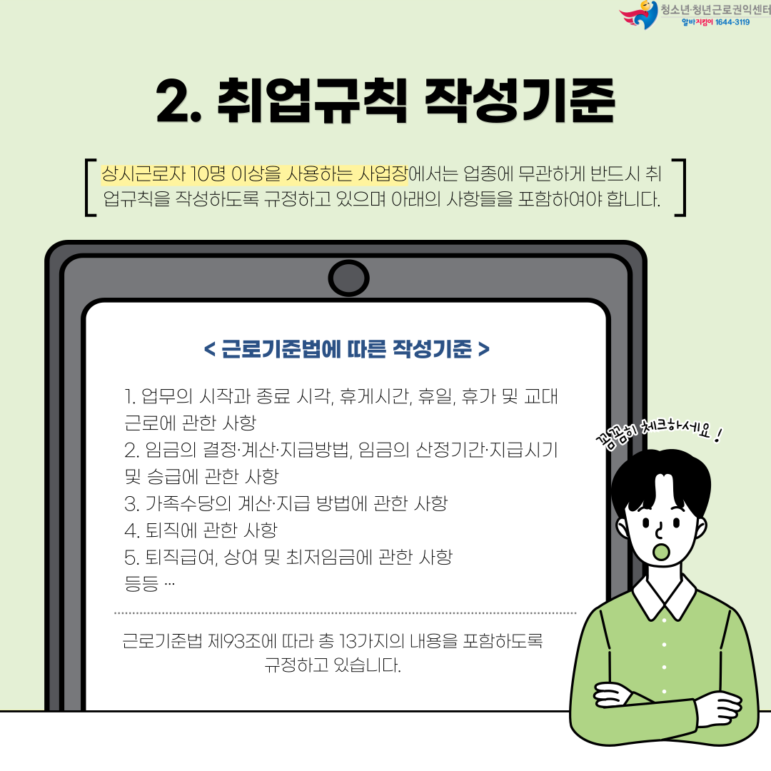 사업장 내 근로자에 대한 근로 및 복무 규율에 관한 기준으로 고용노동부에 신고를 해야 해요 !