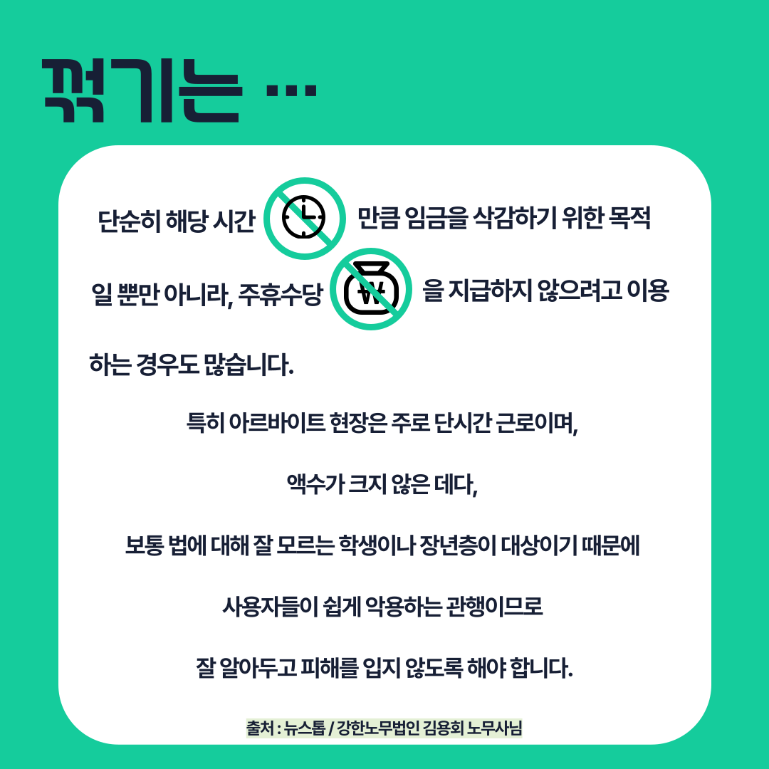 주로 단시간 근로자나, 보통 법에 대해 잘 모르는 학생이나 장년층이 대상으로 악용하고 있는