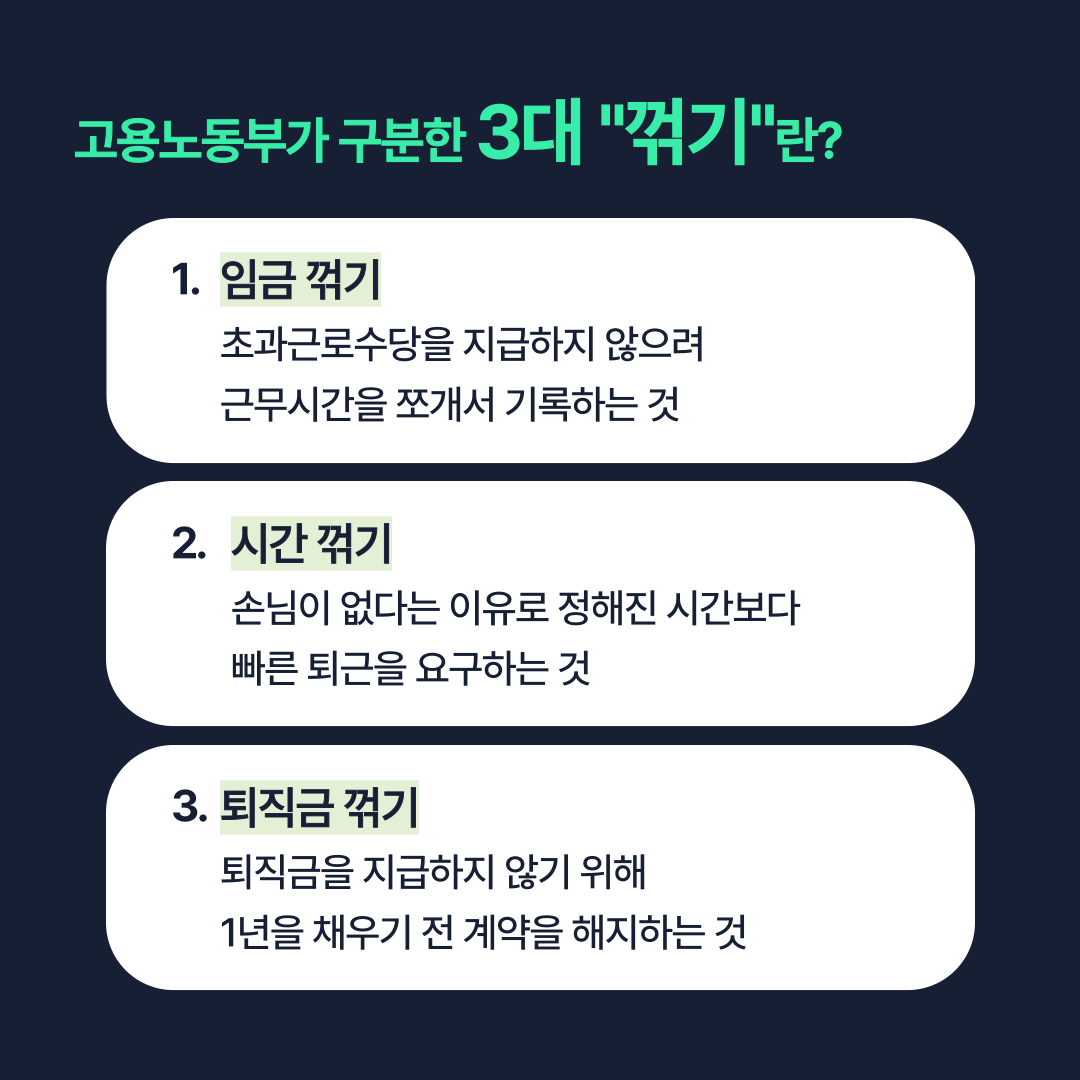 오늘은 고용노동부가 정한 3대 "꺾기"에 대한 카드뉴스를 준비했습니다.