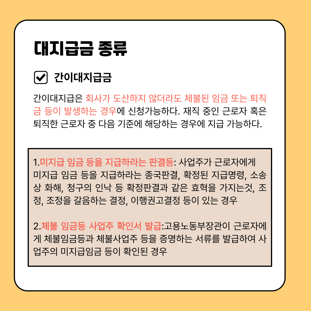 대지급금 제도란 근로자가 회사의 폐업 등으로 인해 임금과 퇴직금을 받지 못한 경우에 고용노동부 장관이 사업주를 대신해 지급하는 제도를 말합니다.