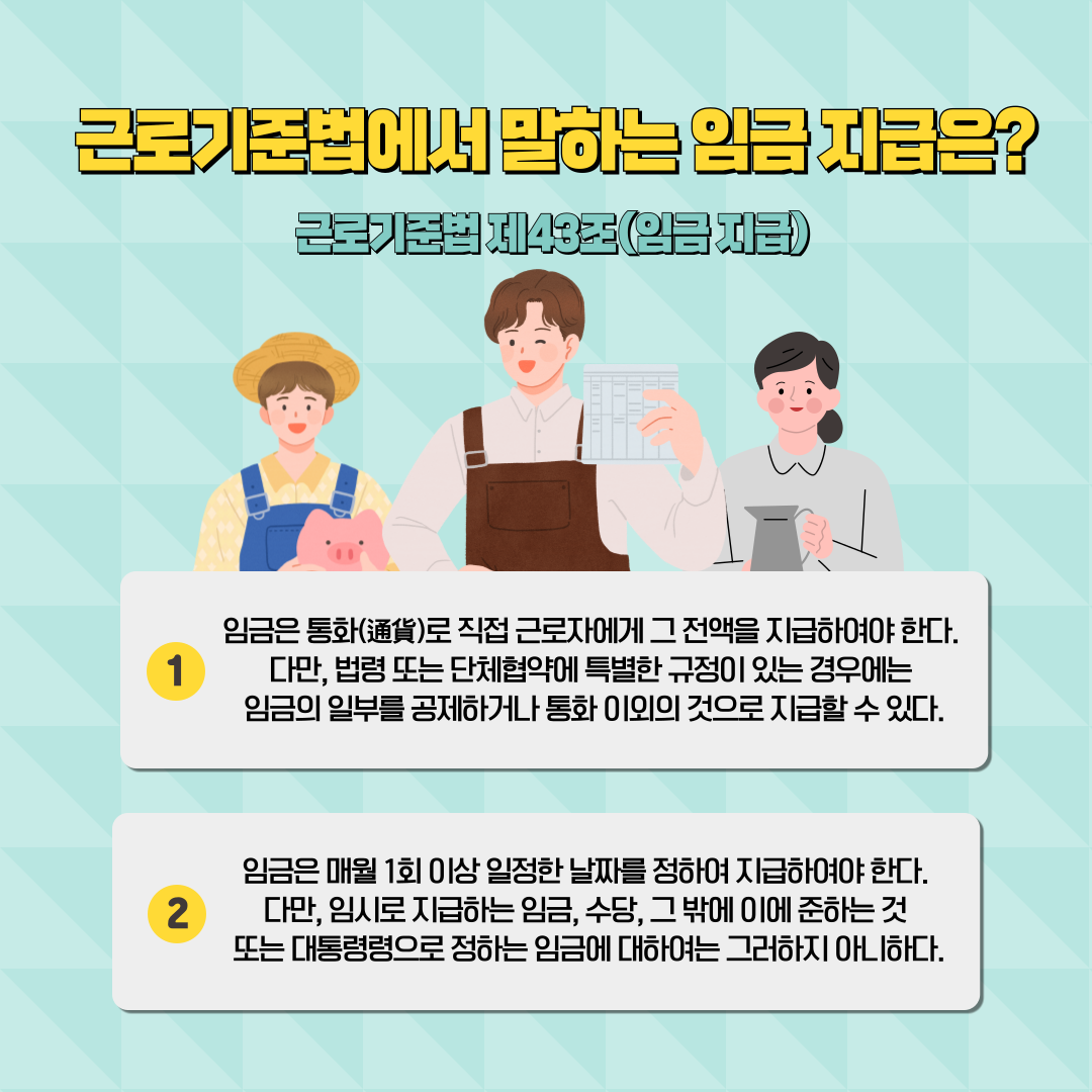 오늘은 「근로기준법 제43조」를 통해 임금지급의 4대 원칙에 대해 알아보려고 합니다.